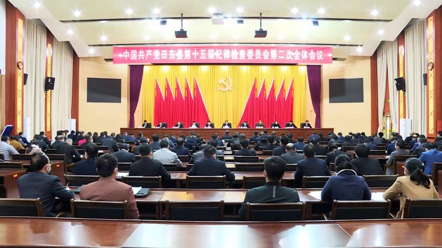 2月17日下午,中共田东县第十五届纪律检查委员会第二次全体会议举行,强调要更加紧密地团结在以习近平同志为核心的党中央周围,在自治区党委和市委的坚强领导下,大力弘扬伟大建党精神,勇于自我革命,忠诚履职、团结进取,坚定信心、勇毅前行,推动全面从严治党、党风廉政建设和反腐败斗争向纵深发展,为实现新时代田东绿色振兴赶超跨越目标提供坚强保障,以实际行动迎接党的二十大胜利召开和庆祝百色建市二十周年。市委常委、县委书记何文凭出席并讲话。县四家班子领导成员,“两院”主要领导等出席。县委常委、纪委书记、监委主任黄学辉主持会议。