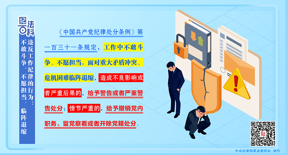 《中国共产党纪律处分条例》第一百三十一条规定,工作中不敢斗争、不愿担当,面对重大矛盾冲突、危机困难临阵退缩,造成不良影响或者严重后果的,给予警告或者严重警告处分;情节严重的,给予撤销党内职务、留党察看或者开除党籍处分。本条是2024年修订的《条例》新增的内容。