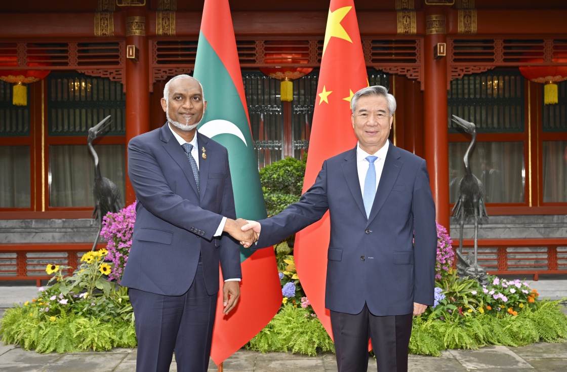 9月2日,中共中央政治局常委、中央纪委书记李希在北京会见来华出席2025年上海合作组织峰会和纪念中国人民抗日战争暨世界反法西斯战争胜利80周年活动的马尔代夫总统穆伊兹。新华社记者 岳月伟 摄