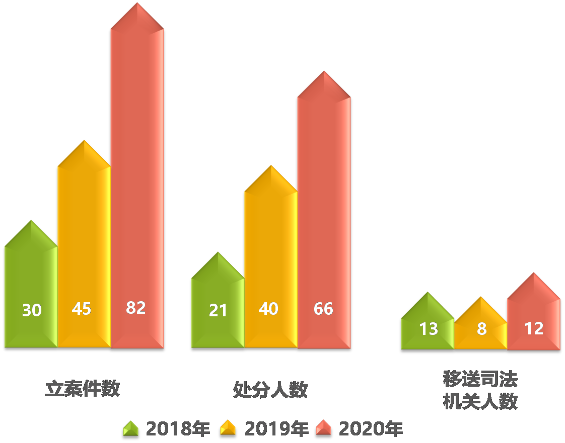 2018年,立案30件,处分21人,移送司法机关13人;2019年,立案45件,处分40人,移送司法机关8人;2020年,立案82件,处分66人,移送司法机关12人。