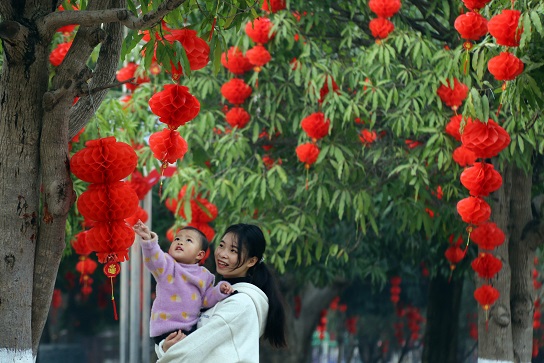 小姐姐抱着年幼的妹妹,一起观赏这挂满枝头的灯笼串串。