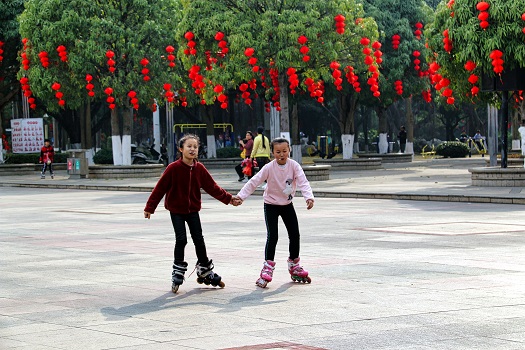 广场上,轮滑小姐妹嘴含棒棒糖,手牵手,聊着天,好不惬意,脚下却是风驰电掣般的速度,只有娴熟的技艺才可如此游刃有余。