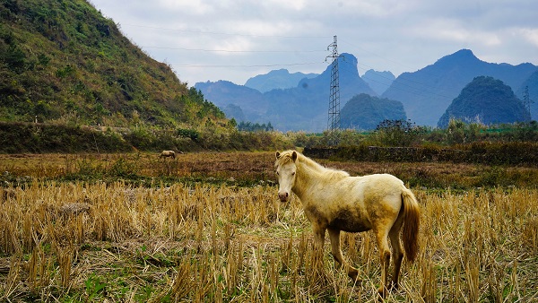 初一踏青,在某个不知名的地方,路遇吃草的小白马。年轻的马儿啊,遇到素未谋面的人儿,眼里写满了好奇……
