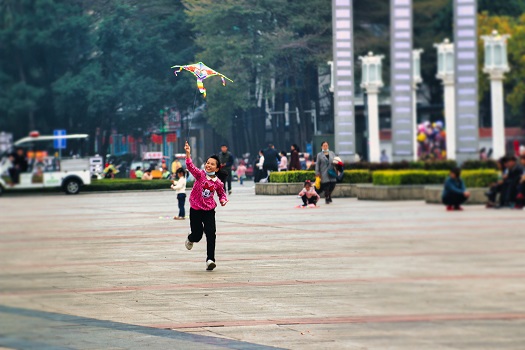 大年初二,平果市文化广场上放风筝的女孩在逆风奔跑,奋力将风筝送上天。