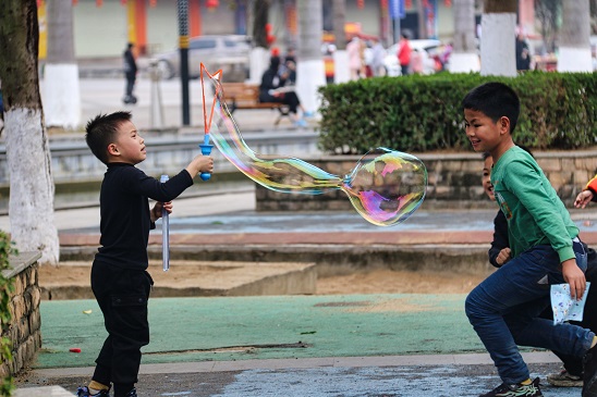 游乐园内,男孩用心地吹出又大又长的泡泡。泡泡被春风带起,旁边淘气的孩子们在追逐、跳跃,试图将飞扬的泡泡打破……