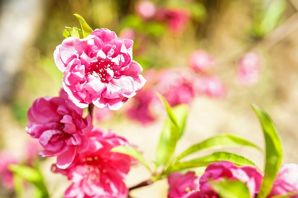 桃花映日红