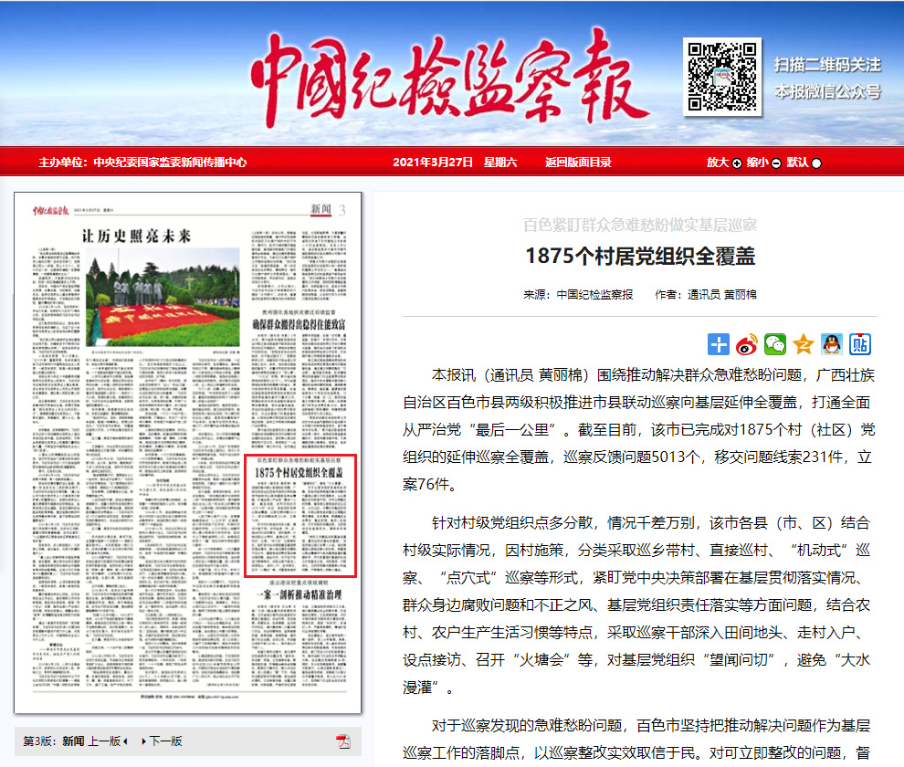 本报讯(通讯员 黄丽棉)围绕推动解决群众急难愁盼问题,广西壮族自治区百色市县两级积极推进市县联动巡察向基层延伸全覆盖,打通全面从严治党“最后一公里”。截至目前,该市已完成对1875个村(社区)党组织的延伸巡察全覆盖,巡察反馈问题5013个,移交问题线索231件,立案76件。