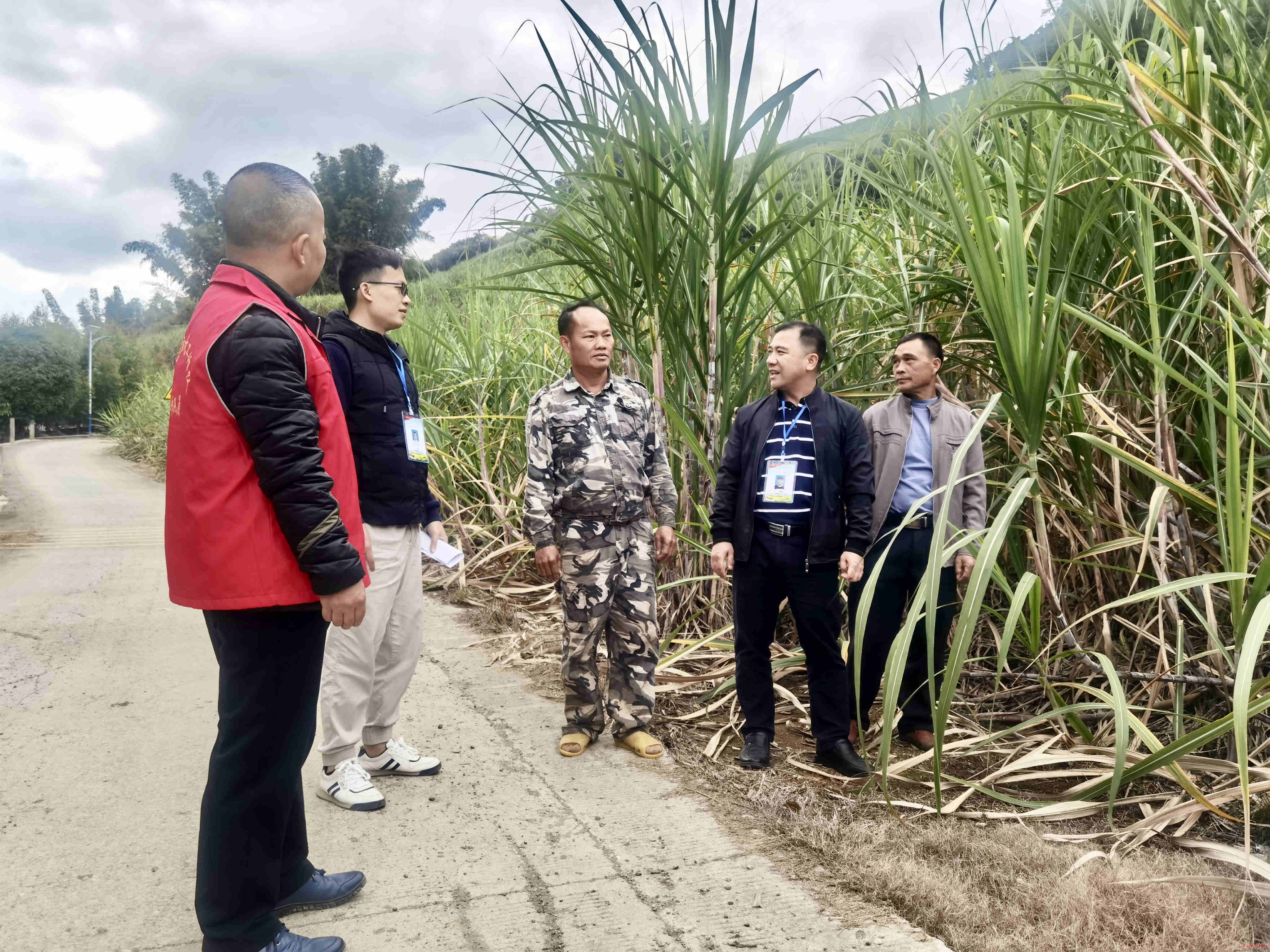 右江区阳圩镇纪委立足职能职责,把巩固脱贫攻坚成果同乡村振兴有效衔接专项监督检查作为“我为群众办实事”实践活动的具体抓手,深入田间地头,与群众拉家常、访实情,抓实抓细监督检查,以精准有力监督推动相关惠民政策的落实。图为该镇纪检监察干部到那等村了解甘蔗种植有关政策落实情况。(黄巳坤/摄)