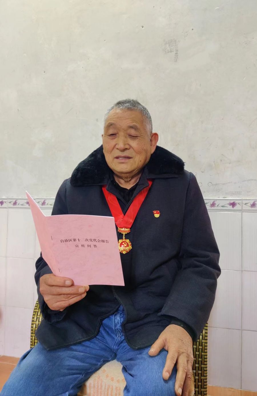 已过古稀之年的老党员郑志光在学习自治区第十二届党代会报告精神