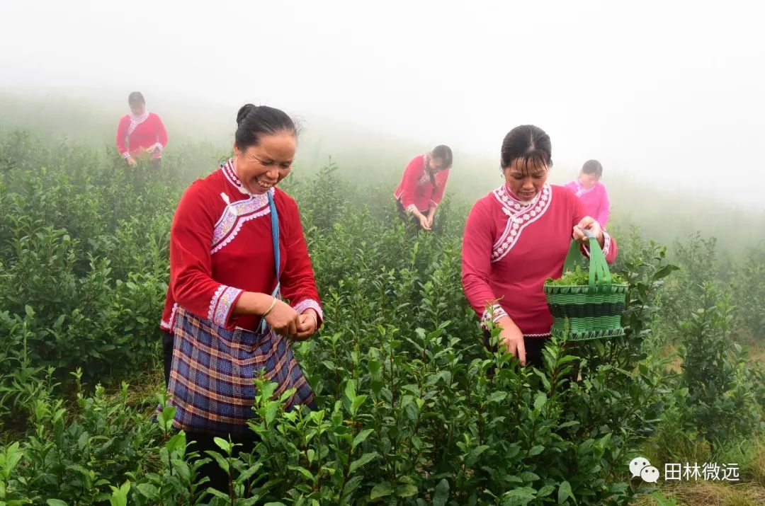 在山顶发展村集体经济产业。梅花山海拔高,云雾大,适合种植茶叶。2016年村里引进杭州神云茶叶有限公司和广西田林坡寿王茶叶有限公司,采取“公司+联合社+农户”模式,在梅花山顶发展茶园283亩,茶叶品种有白茶、龙井茶、黄金茶、太白一号、福建福鼎白毫茶等5个品种。