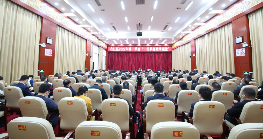 加强党员干部廉政教育是拒腐防变的第一道屏障。右江区坚持教育为先、预防为主,把廉政教育课贯穿到党员干部的日常管理工作中。为进一步做深做实做细对“一把手”和领导班子监督,强化上级“一把手”抓好下级“一把手”,右江区认真落实《关于加强对“一把手”和领导班子监督的意见》,举办“一把手廉政季课堂”活动,按季度由各级党委“一把手”给所在单位党员领导干部上专题廉政教育课,用好有关典型案例“活教材”,打好廉政教育“组合拳”,推动党员干部时刻筑牢信仰之基、绷紧纪律之弦、落实担当之责。今年以来,全区各级党委“一把手”共计讲授廉政教育课20余场次,受教育党员干部达1000余人次。