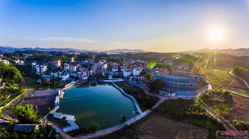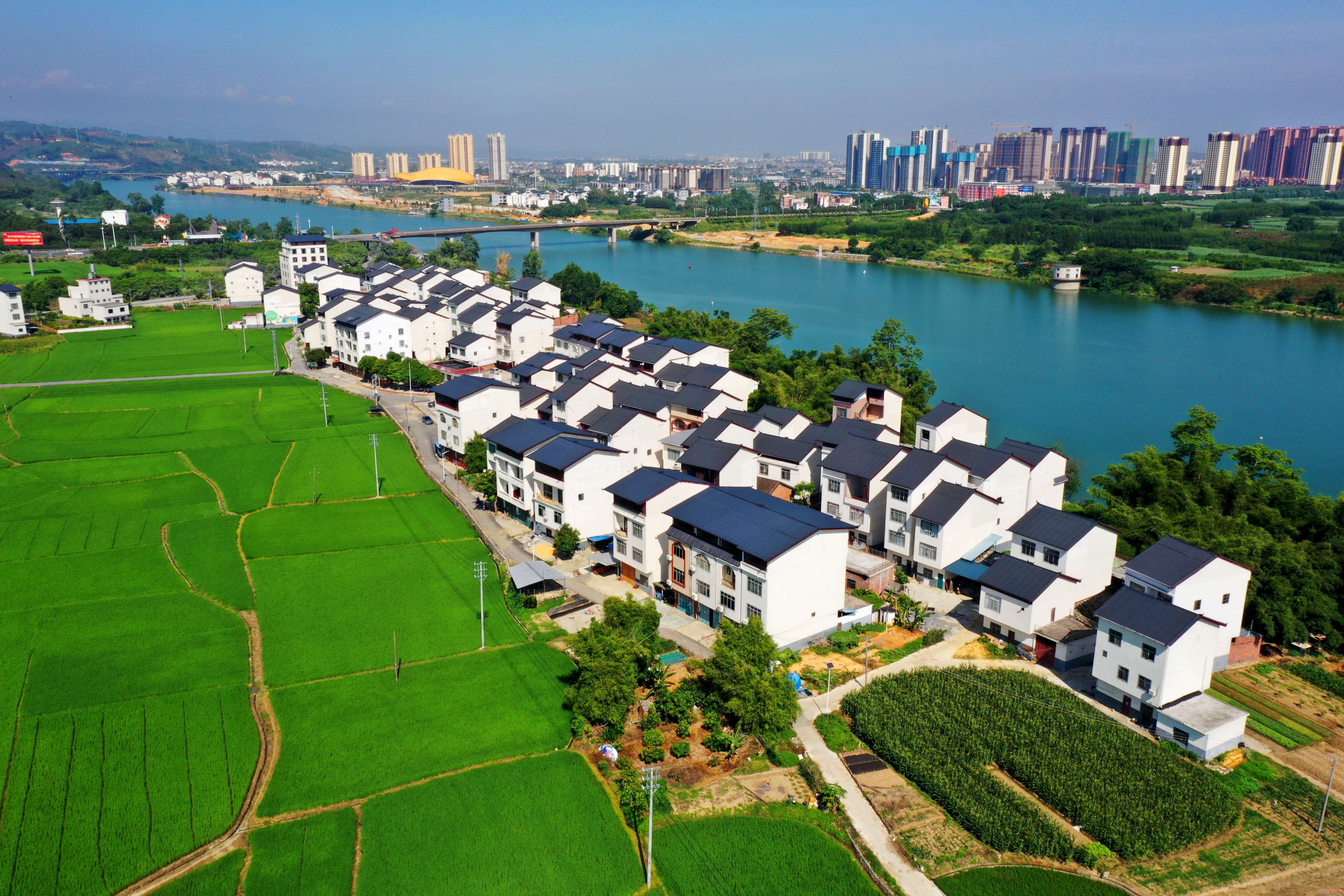 小满时节,容县自良镇龙镇村天清云淡, 白墙青山绿水相映成景,远处人家升起袅袅炊烟,一派村强民富的乡村振兴图景。(容县纪委监委供图 谢德桐/摄)