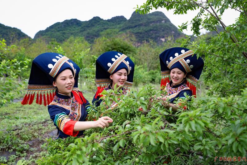 小满时节,微风吹拂,李果正成熟,散发着初夏的清香。一群身穿彩衣的壮族女子正嵌于万绿之中采摘李果,充满着丰收的喜悦。(崇左市江州区纪委监委 梁基聪/摄)