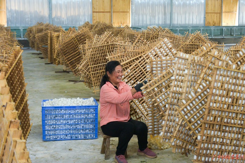小满至,夏意渐浓,又是一年种桑养蚕好时节。连日来,在蒙山县新圩镇,蚕农们忙着采摘、销售今年的第一批蚕茧。如今,桑蚕产业已是广西蒙山县农民增收致富的重要产业之一。图为蒙山县新圩镇养蚕大户的蚕房内,蚕农正在采收今年的第一批蚕茧。(梧州市纪委监委 林志清/摄)
