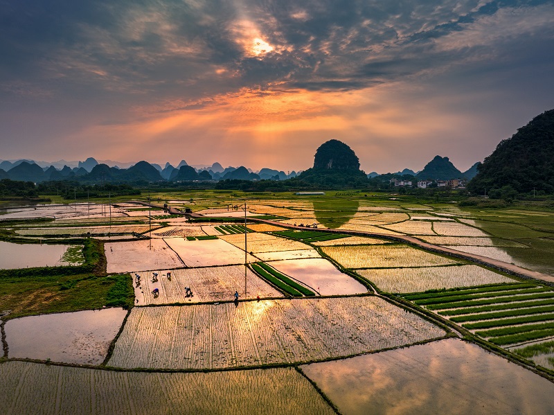 阳朔县土地肥沃,小满时节雨水充沛。图为勤劳的农民抢抓农时开展翻耕水田、插秧等农事作业,为水稻丰收和粮食安全打下基础。(阳朔县纪委监委供 莫志军/摄 )