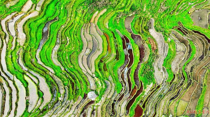 小满至,在三江侗族自治县老堡乡白文村朋界屯三千瑕梯田陆续蓄水,层层叠叠的高山梯田五彩斑斓,宛若打翻的调色盘,美不胜收。(三江侗族自治县纪委监委 龚普康/摄)