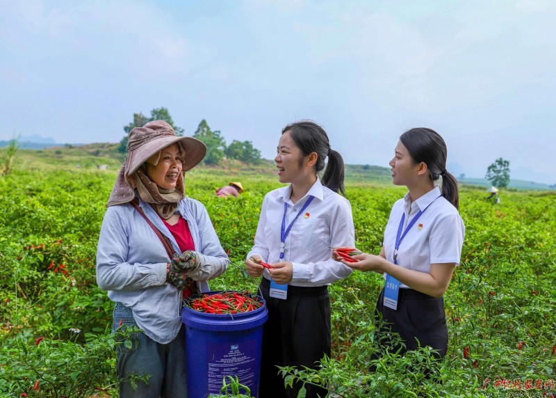 崇左市江州区纪检监察机关将监督“探头”延伸到田间地头,深入查找基层干部在惠民政策落实、干部作风等方面突出问题,进一步规范基层权力运行。图为该区纪检监察干部在新和镇那糯屯辣椒种植基地了解惠农政策落实情况。(崇左市江州区纪委监委 陈欷/摄)