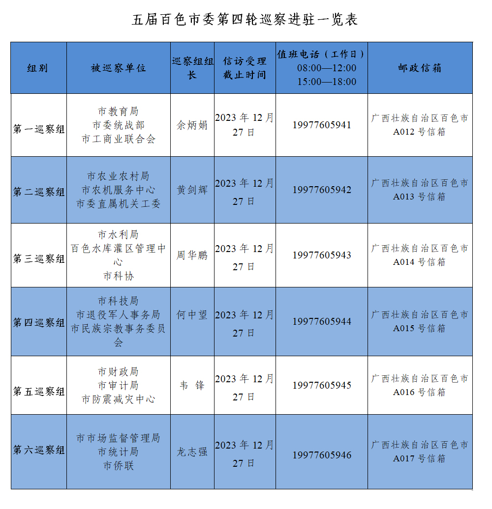 截至10月10日,五届百色市委第四轮巡察派出的6个巡察组已全部完成进驻,并将利用三个月时间,对市委统战部、市教育局等18个市直单位开展常规巡察。